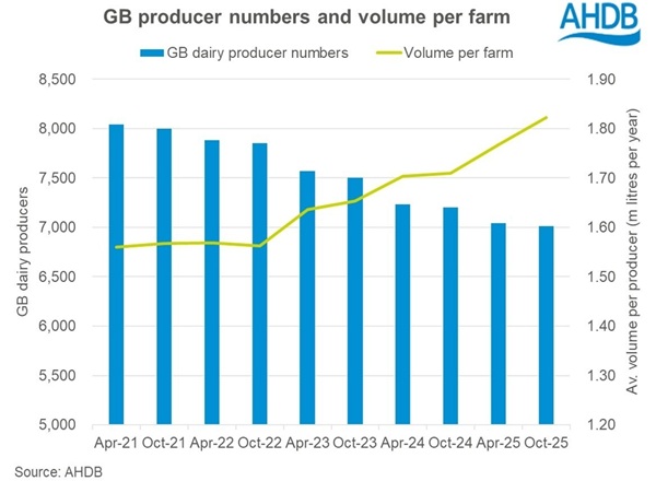 In AHDB's latest survey of major milk buyers, it is estimated that there were 7,010 dairy producers in GB as of October 2025.